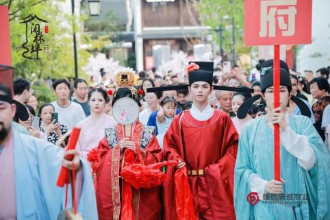 七夕佳节,老街还举行了盛大的宋制婚礼表演,和意中人蟾边月下许愿,相思河畔共放河灯,传统文化氛围中传递出“爱和美”的祝福。丰富多彩的活动,让游客在夜游活动中充分感受千年古埠的繁华,领略多姿的宋韵文化。国风文化节作为唐域商业打造的老街独属IP,已举办至第二届。之后每年都会定期开展,成为一年一度的盛事。
